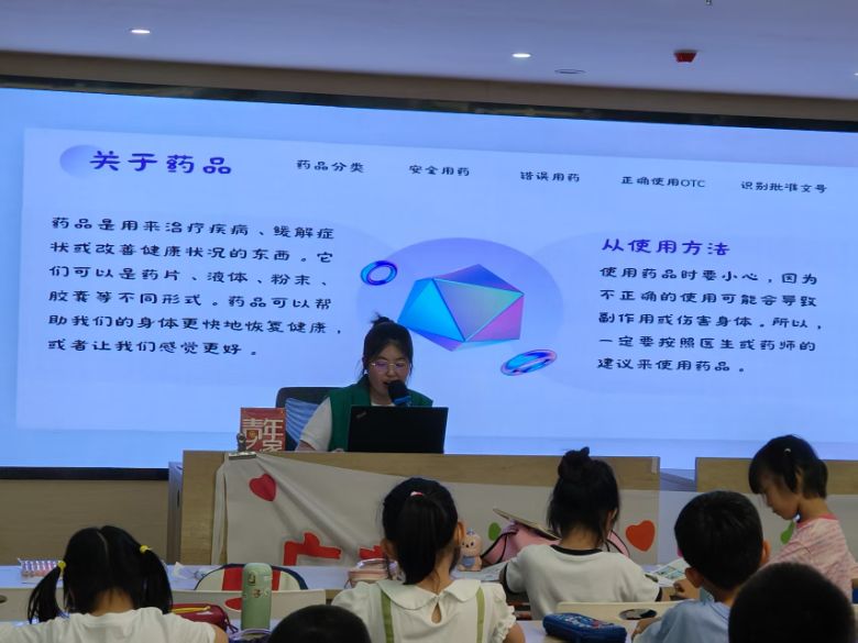 活動中,團隊成員以“藥匣子的秘密”為主題,通過生動形象的圖片和通俗易懂的語言,向孩子們系統講解了藥品的分類標準(如處方藥與非處方藥)、作用原理及潛在風險,并重點強調“遵醫囑用藥”“不濫用抗生素”等核心原則,幫助孩子們建立對藥品的科學認知。主講人指著精心制作的展板,帶著傳神的肢體動作,引領著小朋友們的思維。課堂上不時發出小朋友們"原來是這樣"的感嘆。可以看的出孩子們都非常積極的參與到了課堂中,他們求知若渴的欲望配合著團隊成員們循循善誘的講解編織出這個夏日最悅耳的和弦!