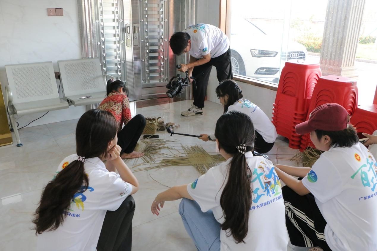 蒲草筑夢實(shí)踐團(tuán)成員圍坐手藝人身旁,一邊學(xué)習(xí)蒲草編織技藝,一邊用鏡頭記錄編織全過程。成員們專注
