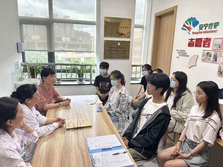 為深入了解寧波地區安寧療護服務的發展現狀,挖掘生命關懷的溫暖故事,7月8日,來自寧波大學“醫心向甬”實踐團隊的9名成員在周紅娣老師和林如意老師的帶領下走進寧波市鄞州區明樓街道社區衛生服務中心安寧療護病房,開展實地調研。團隊成員通過參觀病區設計、訪談醫護人員,深刻感受到安寧療護“以患者為中心”的人文關懷理念,也為推動社會對生命終末期照護的關注貢獻青年力量。
