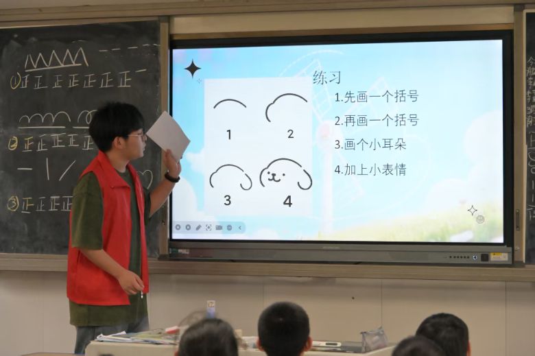 支教活動開班儀式在干凈整潔的教室中拉開帷幕。參與學生與志愿者們輪流自我介紹,瞬間拉近彼此距離。隨后的破冰游戲讓現場氣氛迅速升溫。“你畫我猜”“成語接龍”“模擬跑酷”,現場氣氛活躍,掌聲與歡笑聲此起彼伏。