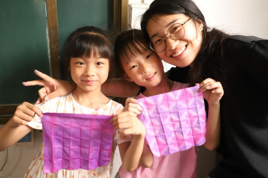活動(dòng)尾聲,孩子們自豪地舉起自己的扎染作品合影留念,這些充滿童趣的作品不僅承載著非遺文化的精髓,也凝結(jié)了孩子們的智慧與汗水。實(shí)踐團(tuán)成員表示,通過(guò)這次活動(dòng),他們深刻體會(huì)到“非遺活化”的意義——讓傳統(tǒng)文化以生動(dòng)的方式走進(jìn)鄉(xiāng)村課堂,激發(fā)孩子們對(duì)傳統(tǒng)工藝的興趣與熱愛(ài)。