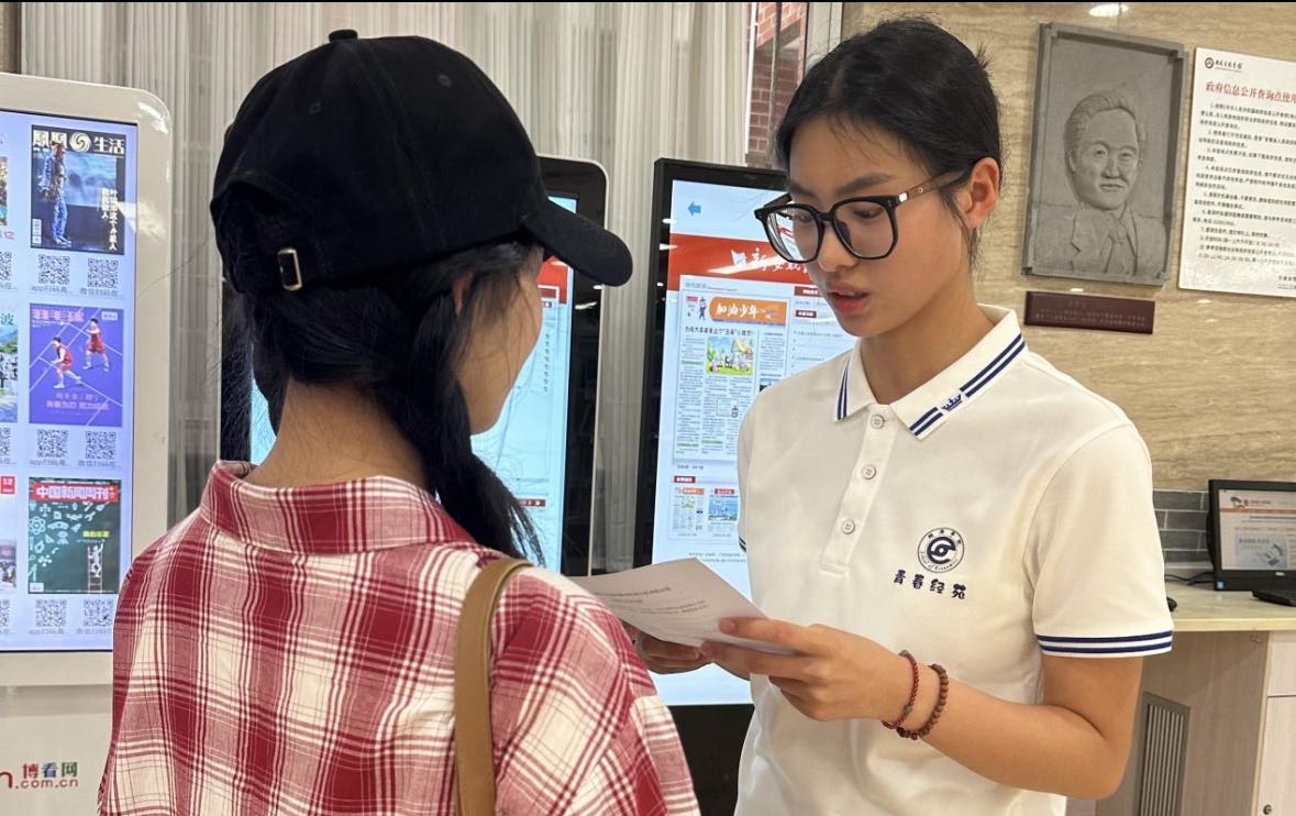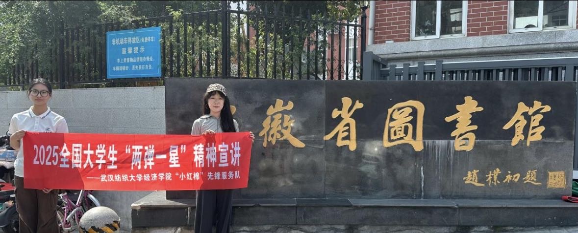 7月9日,武漢紡織大學經濟學院“小紅棉”先鋒服務隊宣講小分隊走進安徽省圖書館,開展全國大學生“兩彈一星”精神主題宣講活動。