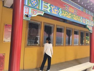 實踐隊隊員們來到龍泉禪寺南門。首先,觀賞九龍壁,上面九條游龍破壁欲出,青赤金白諸色交融,鱗片與云紋分毫畢現,在日光里漾起千年古韻。接著,踏入南門,隊員們隨講解員穿梭天王殿、大雄寶殿,殿內佛像莊嚴,經幡輕拂,歷史與信仰在此交織;探尋龍泉、御井遺存,聽泉水叮咚訴說往昔故事,從建筑規制到人文傳說,一步步解鎖古寺文化密碼,沉浸式感知宗教文化與地域發展的深層聯結。
