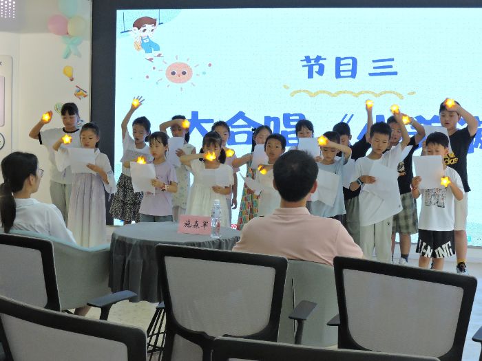 童心綻放,成果閃耀 致辭環節后,夏令營成果展示精彩上演!舞蹈組的八位小營員率先登場,以一支活力四射的《向快樂出發》點燃全場,明快的節奏與靈動的舞姿傳遞出蓬勃朝氣;隨后,八位小朗誦者鏗鏘發聲,帶來詩朗誦《中國紅》,飽含深情的童聲抒發著對祖國的熱愛與自豪,讓紅色基因在心中生根發芽;最后,全體小營員們攜手登臺,用清澈純凈的童聲共同演繹《小美滿》,悠揚的歌聲流淌出孩子們對生活的感悟——家人的溫暖、伙伴的歡笑,便是最珍貴的“小確幸”,這份純粹的幸福也深深感染了在場的每一位觀眾。