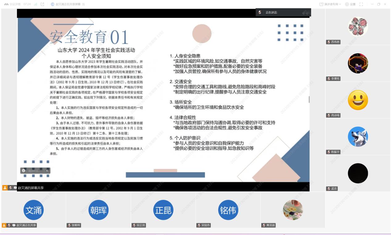 本次活動由團隊負責人趙文涌主持,社會實踐團隊全體成員參與。趙文涌首先著重強調了安全意識的重要性與必要性,他指出團隊成員要時刻牢記安全第一,并介紹了一系列安全防范措施和應急預案。團隊成員們積極參與討論,分享了自己的安全經驗和意見,共同制定了安全教育的具體措施,以確保社會實踐活動在安全保障的前提下進行。接著,趙文涌表達了對團隊的思想建設和協作能力的關注。