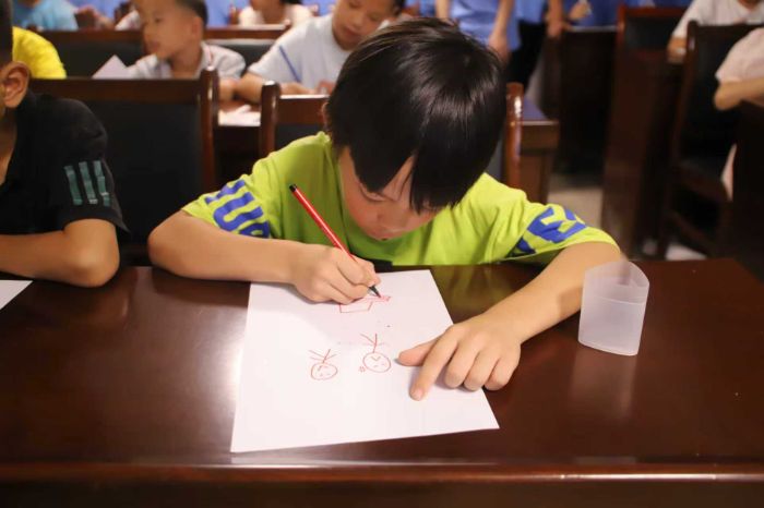 圖為一名身著綠色T恤的男孩正專注描繪自己的畫作,紅色畫筆下的簡筆畫形象躍然紙上。