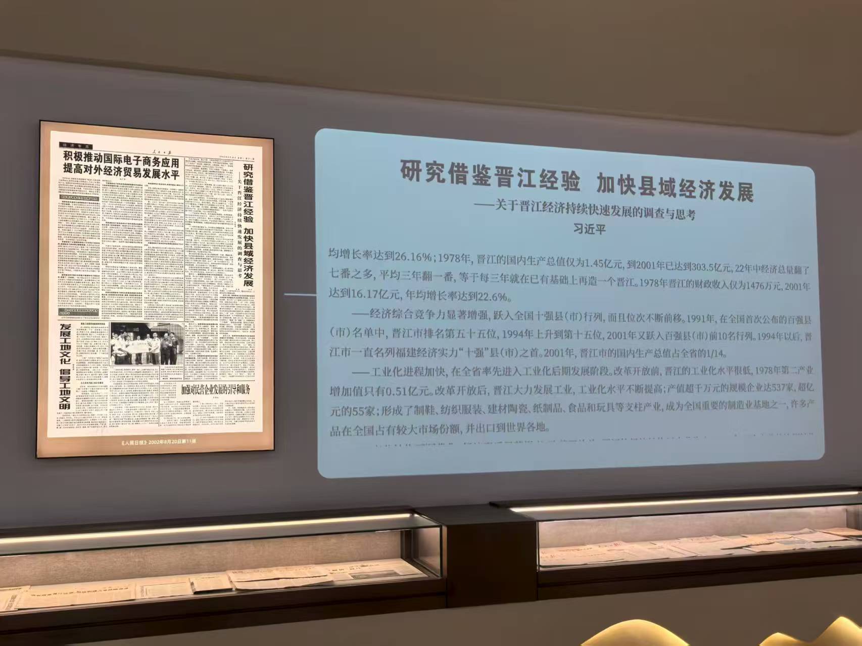 首先,展館講解員播放了晉江經驗的相關視頻,為團隊成員介紹了晉江經驗館是系統展示“晉江經驗”誕生、發展與升華的重要平臺,并用詳實的史料、生動的案例和沉浸式的體驗,全方位呈現了晉江從“高產窮縣”到“中國縣域經濟強市”的跨越式發展歷程。