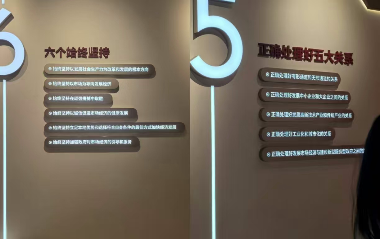 在講解員的帶領下,實踐團隊依次參觀了各個展區。在展墻標語“六個始終堅持”、“正確處理好五大關系”下,玻璃柜中磨破的創業皮鞋與泛黃的股權憑證靜述著改革歷程——這里不僅陳列著發展史詩,更蘊藏著政策智慧與人文精神交織的縣域治理密碼。團隊成員直觀感受到晉江人“愛拼敢贏”的精神特質,以及當地在產業升級、科技創新、城鄉融合等方面取得的顯著成就。