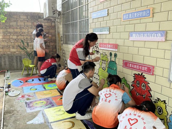 以藝術創意扮靚鄉村角落 “老師,這個怪獸的牙齒要畫得尖尖的!”塘溝村“童學圖書室”旁的墻下,小朋友們圍著隊員們七嘴八舌提建議。突擊隊正在這里開展文化墻繪活動,讓老舊墻面實現“華麗變身”。