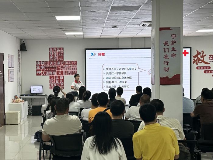 為了將急救知識宣講工作落實到位,團隊成員于7月8日上午前往蘇州市紅十字急救培訓基地接受技能培訓。培訓地點是蘇州100醫院5號樓三樓一間明亮的培訓室,里面設有多媒體影像和專業教學模具,白色墻壁上張貼紅色宣傳標語,“一走進去就感受到‘人道救援’的重要性,我肅然起敬,對急救知識的學習也格外認真”,成員夏成熙深有感觸。專業培訓員圍繞心肺復蘇、AED的使用、氣道異物梗阻、創傷止血技術以及傷病員體位管理等多個方面展開詳細講解。團隊成員一邊仔細聆聽講解一邊利用教學模具進行實操演示與場景化模擬訓練,將理論學習與實踐操作相結合,強化對急救知識的學習效果。
