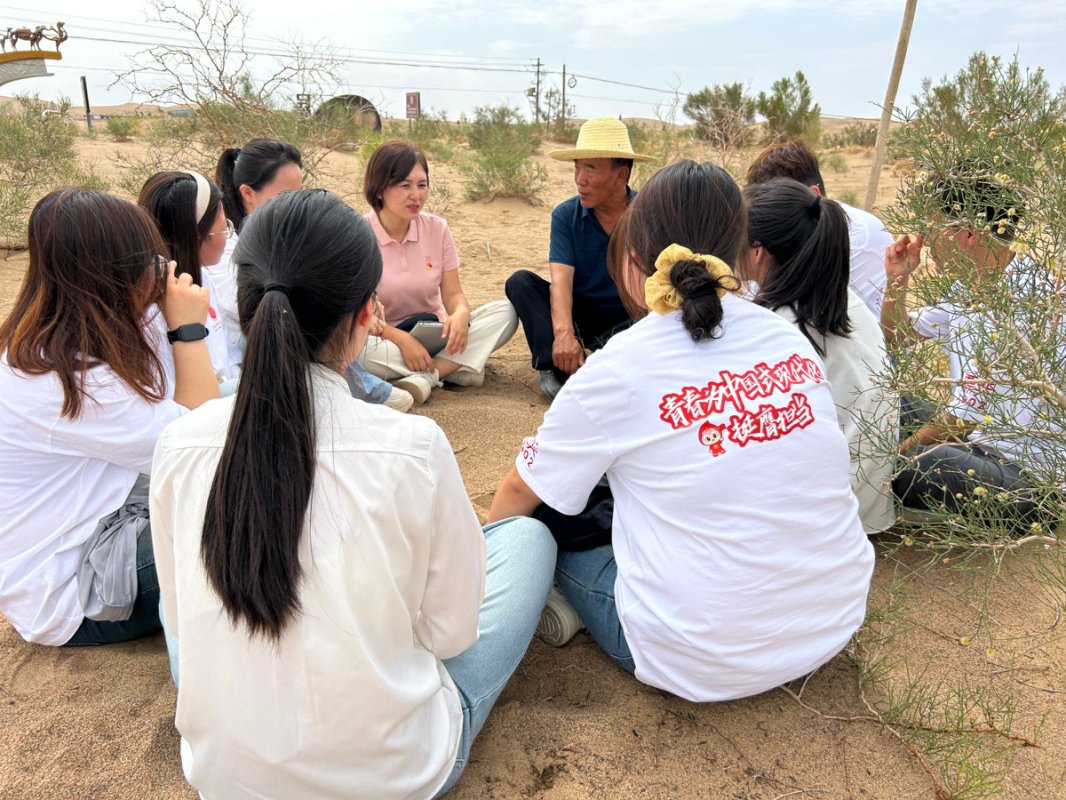 實(shí)踐團(tuán)在指導(dǎo)老師的帶領(lǐng)下,充分發(fā)揮專業(yè)優(yōu)勢(shì),在沙漠中開展了一堂“行走的思政課”。團(tuán)隊(duì)成員馬婷婷、朱江霞以“蘇武山下石榴紅,共繪民族同心圓”為主題,生動(dòng)講述了民勤縣各族群眾聯(lián)手治沙的當(dāng)代故事,她們的分享不僅引導(dǎo)同學(xué)們深入思考中華民族共同體意識(shí)的深刻內(nèi)涵,更讓抽象的理論知識(shí)在鮮活的實(shí)踐案例中變得可知、可感、可觸。在蘇武沙漠景區(qū),實(shí)踐團(tuán)拜訪了當(dāng)?shù)刂紊橙死钗墓饫先耍犓v述久久為功征戰(zhàn)沙海、播撒希望的故事。 作為土生土長(zhǎng)的民勤人,李文光見證了沙漠的變化。談起以前,“沙丘上面不長(zhǎng)樹木,一起風(fēng),沙子就全部蔓延開了,一場(chǎng)風(fēng)后,房子被掩埋了半部分,一年一場(chǎng)風(fēng),從春刮到冬……”回憶起往事,李文光臉上的褶皺不自覺加深,“家家戶戶因?yàn)辄S沙種不出地、養(yǎng)不起牛羊,只好卷起鋪蓋,遠(yuǎn)走他鄉(xiāng)。”面對(duì)“沙進(jìn)人退”的困局,很多人選擇離開,故鄉(xiāng)的情結(jié)拴住了這位年輕人,治沙的決心留下了這位“真愚公”。 “為啥要選擇種樹,而且一種就是一輩子?”面對(duì)實(shí)踐團(tuán)的疑問(wèn),李文光老人目光望向遠(yuǎn)方連綿的沙丘,聲音不高卻字字千鈞: “我就想試試看,咱到底能不能干成這件事,你想啊,要是你走了,他走了,我也走了,這黃沙可不會(huì)走!它只會(huì)埋了田,吞了房,到最后,子子孫孫連個(gè)落腳的地兒都沒(méi)了,咱祖祖輩輩活命的地方,可就真叫沙子給抹平了……” 從黃沙漫漫到綠染沙丘,從沙逼人退到治沙致富。一個(gè)人的堅(jiān)守,是孤勇者的悲歌;一群人的堅(jiān)守,便是改天換地的壯舉。千千萬(wàn)萬(wàn)個(gè)李文光,為了心中同一個(gè)綠色的夢(mèng)想,不辭辛勞、不畏艱險(xiǎn),用血汗?jié)补嘞M陲L(fēng)沙最狂處扎根。他們用粗糙的雙手,一寸寸奪回被風(fēng)沙侵蝕的家園,一點(diǎn)點(diǎn)編織綠色的未來(lái),把家鄉(xiāng)一點(diǎn)點(diǎn)建設(shè)得更加美好。 這不僅僅是種樹,這是平凡人鑄就的非凡史詩(shī),是萬(wàn)千中國(guó)治沙人用生命書寫的綠色宣言,更是一個(gè)民族對(duì)家園最深沉的眷戀與最堅(jiān)韌的守望——家園在,希望就在;生命不息,治沙不止!