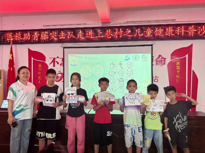 口腔健康板塊注重實踐,隊員用牙齒模型拆解切牙、尖牙等功能,通過動畫演示蛀牙病理,并帶領孩子用“巴氏刷牙法”實操練習,將理論轉化為行動;顒游猜暤“護齒繪畫比賽”成為創意與健康的融合舞臺。孩子們用畫筆描繪心中的“健康牙齒”,最終6幅作品因“科學認知與藝術表達兼具”榮獲“最佳護齒衛士”稱號。全體參與兒童均獲得牙齒徽章、牙齒涂涂樂,牙齒沙畫的“大禮包”,讓知識傳遞與行為激勵形成閉環。