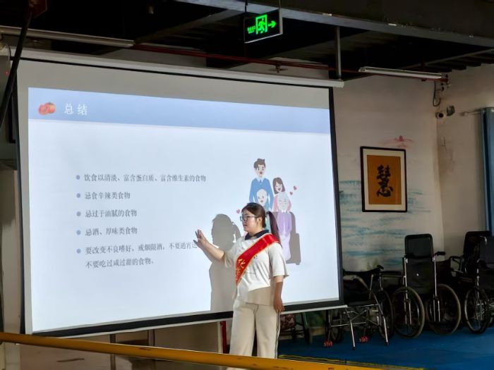 來到慧德養(yǎng)老公寓,針對老年人的生理心理特點,開展健康飲食知識宣講,生動講解味覺嗅覺遲鈍、器官功能減退、動作協(xié)調(diào)性降低、適應(yīng)能力減弱等生理心理變化對飲食帶來的影響,隨后重點解讀“十大健康飲食原則”,建議老年人每日少食多餐,用豆制品替代部分肉類食品,采用蒸、煮、燉等烹調(diào)方式,減少油炸食品攝入,推薦輪換不同植物油以均衡攝取脂肪酸,提醒老人從花生、核桃等堅果中獲取營養(yǎng),填補老年人對飲食健康的認(rèn)知空白。針對高血壓群體,志愿者講解“少三白”“多三黑”的飲食原則,結(jié)合每日食鹽不超過6克、多吃堿性食物等建議,說明其對慢性病防控的作用,幫助老年人了解飲食與健康的關(guān)聯(lián)。