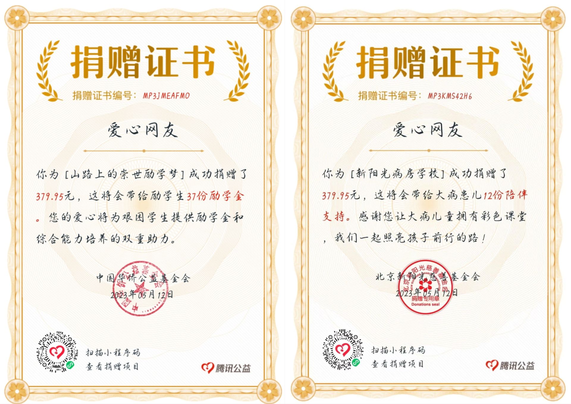 義賣(mài)有價(jià),愛(ài)心無(wú)價(jià)。本次愛(ài)心手工捐贈(zèng)活動(dòng)共募得愛(ài)心款759.9元,分別向“新陽(yáng)光病房學(xué)校”和“山路上的崇市勵(lì)學(xué)夢(mèng)”項(xiàng)目各捐贈(zèng)379.95元,助力大病兒童擁有彩色課堂,共建艱困學(xué)生的求學(xué)之路。