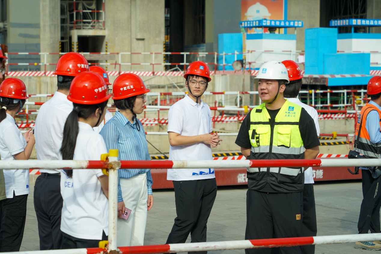 本次參訪最后一項行程,實踐團來到中建八局上海公司金融城D項目,這是上海西岸金融城的核心地塊。項目負責人為實踐團詳細介紹了工程概況、深基坑施工技術和超高層施工技術并重點介紹了項目中的智能建造應用。進入施工現場,實踐團親見施工機器人和智慧工地現場進度與資源調配情況,切身感受到科技賦能工程建設的深刻變革,更對建筑行業智能化轉型有了立體認知。