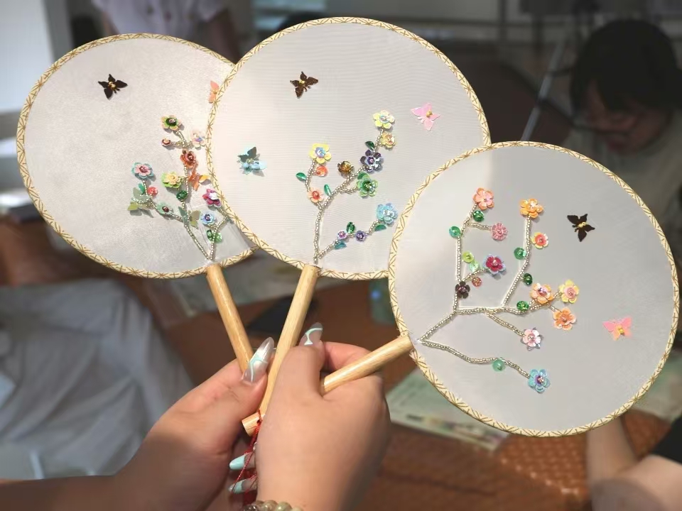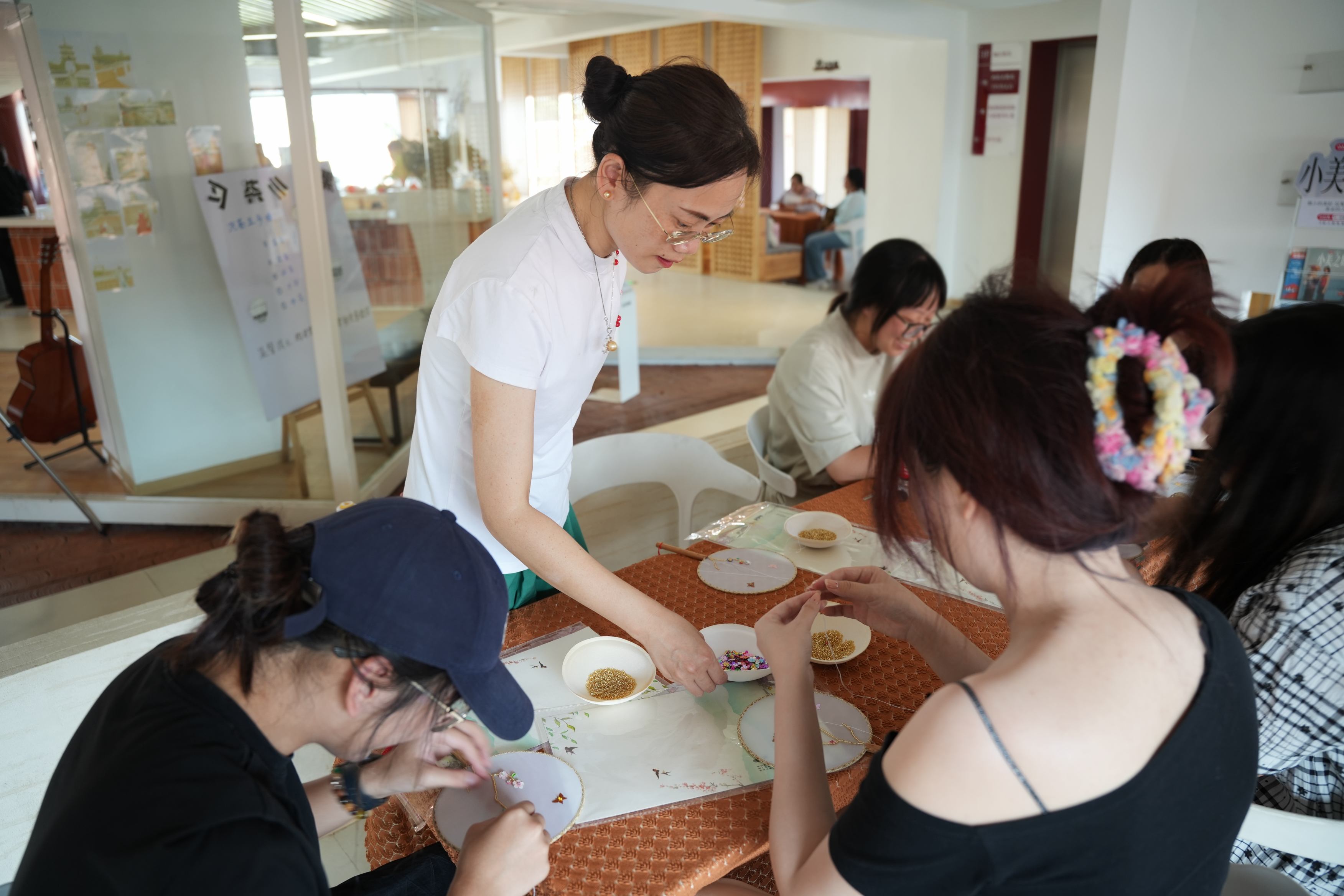 指尖捻線時,才懂非遺傳承的溫度。在珠繡老師的指導下,隊員們執起繡針,學著將細小的珠子固定在布面,體驗著從生澀到漸入佳境的過程。穿針、打結、走線,看似簡單的動作里藏著數十年的功夫,正如老師說的“一針不準,滿盤皆輸”。當大家捧著自己的習作與老師并肩合影時,鏡頭里定格的不僅是笑臉,更是一場跨越代際的接力——老手藝在年輕指尖流轉,傳統便有了奔向未來的力量。