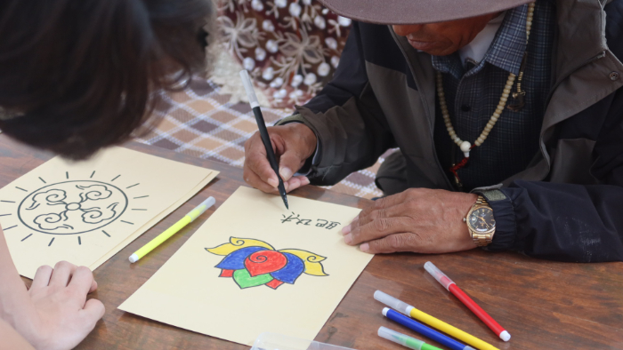 而繪畫區摒棄復雜構圖,采用預制打印的藏族傳統圖騰。老人們執筆悉心填染,隊員趙芳珍、楊仁熙從旁協助。當一幅幅黑白線稿在代際協作中煥發瑰麗色彩,圖騰不再是靜止的符號,而成為漢藏智慧共同激活的文化基因。