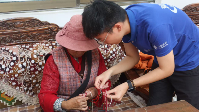 巧手生萬象:指間流淌的文明印記 繩結千千扣,系緊血脈同心。繩結編織區里,團隊成員早已備好各色彩繩,五彩的絲線在桌上鋪展開來。成員們向老人們展示了預先編好的中國結與玉米結成品,并耐心講解編織技巧,一步一步細致示范。"左線壓右線,從圈中穿出,再重復一次......"團隊成員周子遊在參與體驗的爺爺身旁,手把手教學基礎中國結的盤繞技法。中國結的盤曲纏繞象征著團結與吉祥,玉米結的緊密交錯寓意著豐收與圓滿,這些承載著美好寓意的繩結,在老人們的手中漸漸有了溫度。