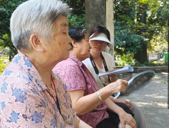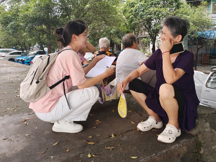 走近社區老年群體是隊員們社會實踐活動的重點。在毛塘社區、力創社區的涼亭里、樹蔭下,與老人們圍坐交流。張奶奶滿臉笑容的分享:“我已經在這住了好幾十年咯,這里的樹呀都好大好涼快的,我天天都會出來散散步活動活動。”,隊員們耐心傾聽老人們對小區改造成果的認可,也認真記錄下他們對進一步優化的期待與建議。這些質樸的話語,不僅展現了適老化改造對老年人生活帶來的積極改變,也為團隊后續完善調研建議提供了方向。