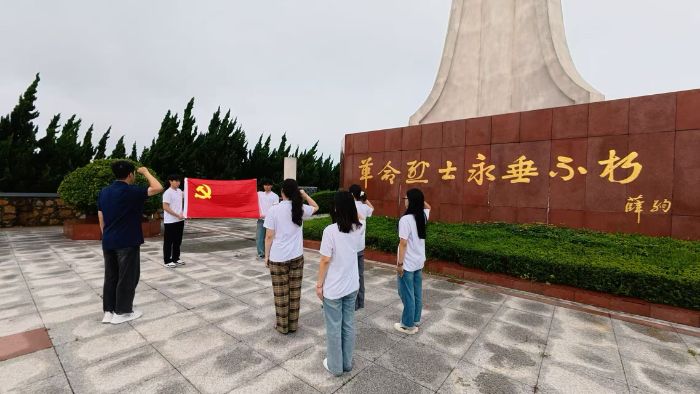 實踐隊的首站來到了莊嚴肅穆的嵊泗縣革命烈士陵園,深刻感悟東海前哨的紅色精神力量。道路兩邊的龍柏高聳,實踐隊成員們肅立烈士紀念碑前,重溫入黨誓詞,誓言聲在老宮山頂久久回蕩。