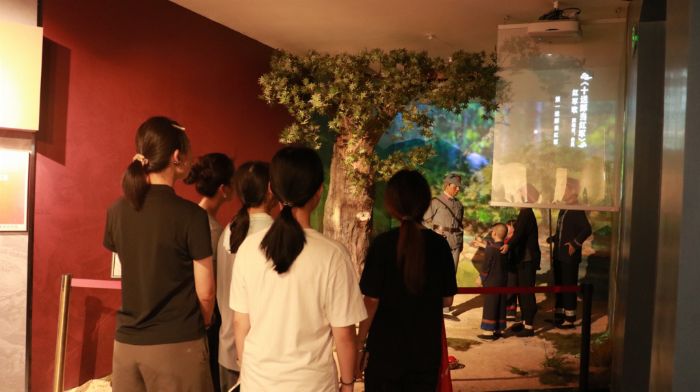 序廳的仿銅浮雕壁畫,瞬間將隊員們帶入畬族的世界。山川、歷史、民俗在刀刻紋路中流淌,奠定了探訪的基調(diào)。“福安畬族歷史記憶”展區(qū),全息影像生動還原了畬民種菁勞作的場景。隊員們駐足凝視,影像中彎腰勞作的姿態(tài),與序廳壁畫形成跨越時空的對話,讓支撐一方經(jīng)濟的“福建菁”歷史變得立體可感。