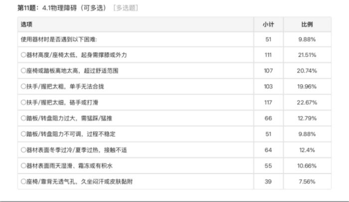 團隊開展《老年用戶健康情況及健身鍛煉基本情況調查問卷》調研,涵蓋多方面問題。數據顯示,超七成老人依賴社區戶外器材鍛煉,卻面臨器材高度不適、扶手防滑性差等物理障礙;近半數反映器材晃動、夜間無反光標識等安全隱患;七成老人因說明文字過小、圖示復雜不會正確操作。78歲的張爺爺就提到想練太極輪但握把太細打滑,練幾分鐘就不敢練了。
