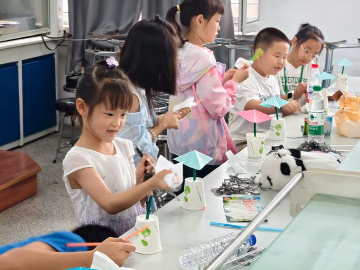 隨后的“靜電風(fēng)車”實(shí)驗(yàn)中,小朋友們將彩紙折角、固定于筆桿,用摩擦后的塑料管靠近彩紙,風(fēng)車便因靜電引力轉(zhuǎn)動(dòng)。課程還拓展了靜電在生活中的應(yīng)用,如衣物吸灰、激光打印、防靜電手環(huán)等,讓孩子們理解“看不見的電”的實(shí)際價(jià)值。