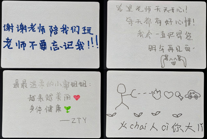 四、友誼長存:文載祝福,情誼綿長 時光匆匆,暑托班雖已畫上圓滿的句號,但團隊成員與孩子們在朝夕相處中結下的深厚情誼卻愈發綿長。結班當日,大家彼此之間互贈祝福傳遞心意,以約定承載期盼,讓這份夏日限定的溫暖跨越時光,在未來的日子里靜候重逢。