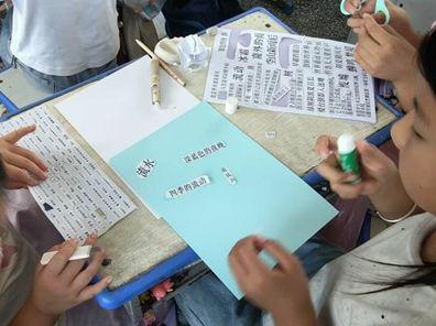 課堂上,都老師將經典詩詞和歌詞打印在白紙上,孩子們可以自由選擇自己喜歡的詞句,用剪刀小心翼翼地剪下,再拼貼到彩色卡紙上。有的小朋友選擇了“春風又綠江南岸”的盎然生機,有的則偏愛“夜空中最亮的星”的浪漫旋律。每一個選擇都映射出孩子們內心深處的情感與向往。