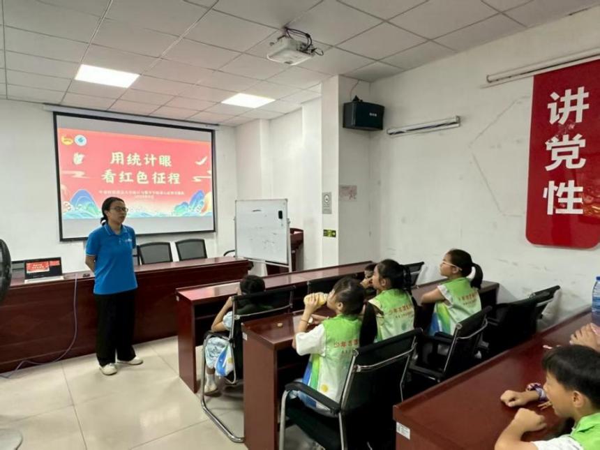 實踐隊員楊奕睿為孩子們講授了《時間軸上的紅色密碼》課程,讓孩子們在趣味互動中觸摸百年黨史的脈絡。她用標注著從中共一大到新中國成立的關鍵節點數據的時間軸,拋出“黨員平均年齡的秘密”的問題,引導孩子們發現了兩代黨員在青春歲月中踐行使命的共性。楊奕睿還展示了不同年代的黨員人數統計表,引帶領孩子們計算增長倍數,在折線圖的攀升中思考數據背后關于奉獻的故事。