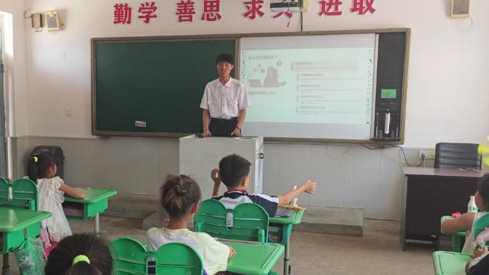 清晨的娘娘宮村小學里,朗朗書聲喚醒了寧靜的村莊。實踐隊員們化身“臨時老師”,為孩子們開設了愛國思想教育,暑期防火防溺水安全教育。課堂上,隊員們用生動的故事講解知識,用互動游戲激發興趣,原本羞澀的孩子們漸漸敞開心扉,眼中閃爍著對知識的渴望。