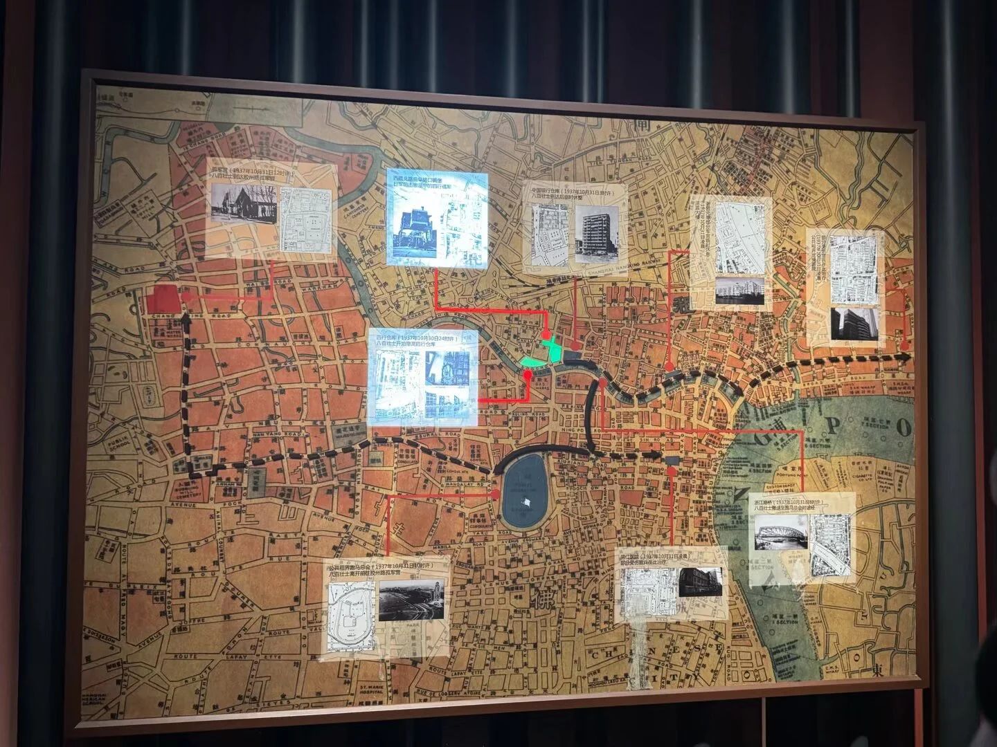 展廳陳列了“八百壯士”的撤退線路圖,該圖展示了短短十二個小時內“八百壯士”從四行倉庫邊打邊撤、艱難抵達膠州路孤軍營的行程。線路雖曲折蜿蜒,卻彰顯出戰士們抗戰到底的決心。