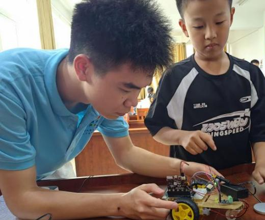 “尋跡小車”課程則更注重自主探究。從硬件組裝到代碼調試,成員們鼓勵孩子們大膽嘗試:“別怕出錯,每一次嘗試都是進步。”孩子們分組協作,有人組裝,有人編程。調試時,面對傳感器靈敏度問題導致小車“不聽話”,他們毫不氣餒,圍攏討論或主動請教。當合作解決難題、小車穩穩沿軌跡前行時,孩子們臉上洋溢的成就感,讓成員們真切感受到了教育的力量。