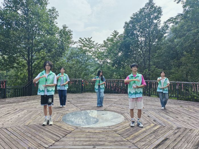 休息之余,在一片開(kāi)闊的林間空地上,實(shí)踐隊(duì)員們打起了太極,列隊(duì)整齊,緩緩起勢(shì),動(dòng)作如行云流水,剛?cè)岵?jì)。他們或舒展雙臂,似“白鶴亮翅”,引動(dòng)林間清風(fēng);或沉穩(wěn)下按,如“野馬分鬃”,扎根腳下沃土。一招一式,吐納有序,將太極的圓融、和諧與森林的寧?kù)o、生機(jī)完美相融。隊(duì)員們神情專注,在古樹(shù)的環(huán)抱與鳥(niǎo)鳴的伴奏下,身心沉浸于這難得的自然韻律之中,感受著天地人合一的寧?kù)o與平和。
