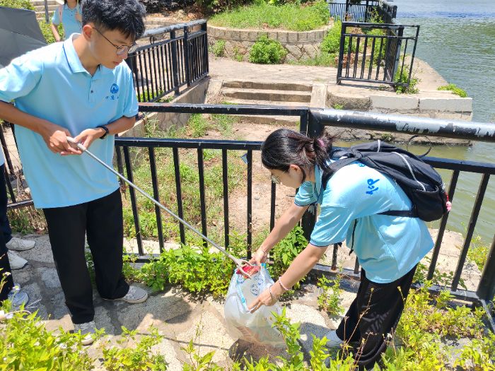 圖為實(shí)踐隊(duì)員在公園岸邊撿垃圾。謝若璟 供圖