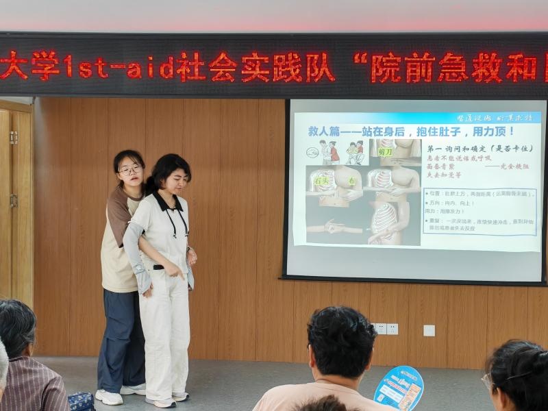 針對(duì)老年人容易發(fā)生的嗆噎風(fēng)險(xiǎn),實(shí)踐隊(duì)進(jìn)行了海姆立克急救法的重點(diǎn)講解和現(xiàn)場(chǎng)演示。兩名隊(duì)員配合默契,一人模擬被異物卡喉,另一人則標(biāo)準(zhǔn)示范施救動(dòng)作:“站身后→抱肚子(肚臍上方兩指)→用力快速向上向內(nèi)頂!”清晰的動(dòng)作分解和“剪刀、石頭、布”的定位口訣讓居民們印象深刻。宣講還特別強(qiáng)調(diào)了預(yù)防嗆噎的重要性,給出了“小口吃、專心吃、慢慢嚼、坐直吃、喝水送、小心吃、吃藥慢”等七條實(shí)用進(jìn)食安全貼士。對(duì)于自救、救助輪椅或臥床患者等不同場(chǎng)景下的操作要點(diǎn),也進(jìn)行了詳細(xì)說(shuō)明。