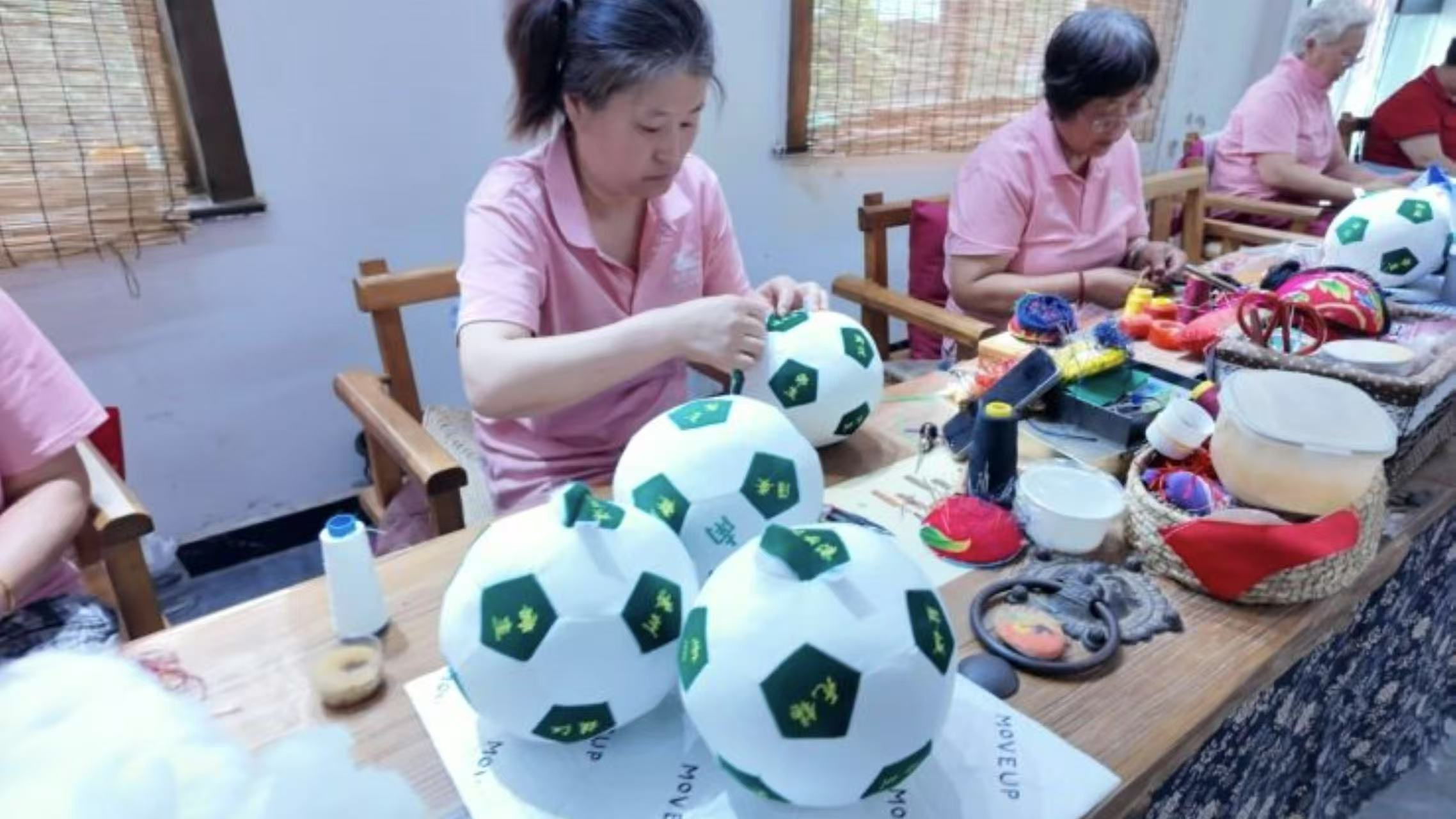 圖為馬莊香包科教文化所內(nèi)師傅們制作″蘇超″足球香包圖。吳東興 供圖