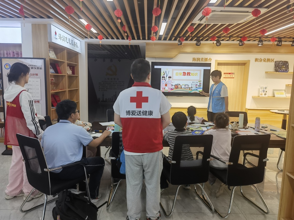 急救知識講解是本次愛心暑托班的重要內容之一。實踐團成員們提前深耕急救知識,為孩子們帶來了一場生動實用的急救知識講座。志愿者通過圖文演示和現實操作,向孩子們講解了心肺復蘇、傷口包扎、海姆立克急救法等常見急救技能。孩子們積極參與互動,認真學習每一個步驟,并在志愿者的指導下進行實際操作練習。這場講解讓孩子們扎實掌握了基礎急救知識與技能,有效提升了應對突發狀況的能力,而這份“守護自己與他人”的本領,必將在他們的成長歷程中留下深遠影響。