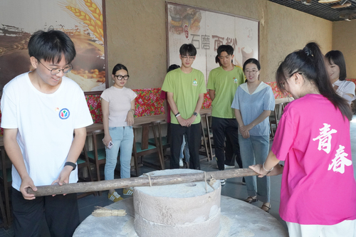 實踐團成員在劉古良民俗村體驗磨豆。徐鵬程供圖