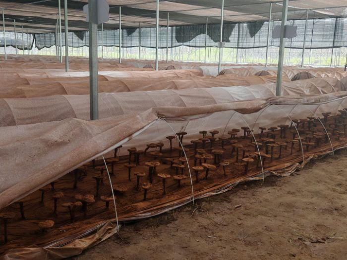 更令人震撼的畫卷在下符橋鎮靈芝種植基地展開。時值八月,正值靈芝噴粉的黃金季節。放眼望去,數百座標準化靈芝大棚整齊排列,綿延不絕,蔚為壯觀,構成了一片孕育生命奇跡的獨特“森林”。團隊成員深入大棚,近距離觀察并詳細記錄了靈芝孢子粉的采集過程:工人們小心翼翼地覆蓋特制收集膜,待飽含精華的孢子粉自然彈射附著后,再進行專業的收集、篩選與儲存。
