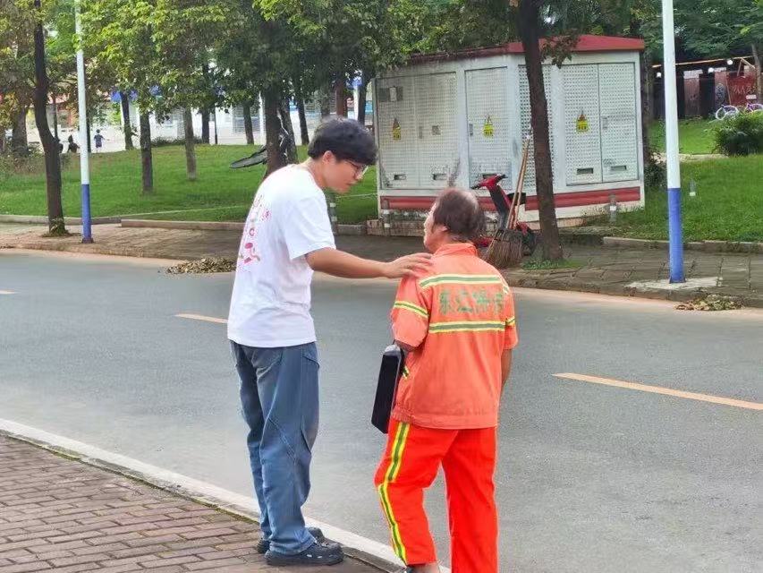 交流過程中,因阿姨不太懂普通話,精通客家話的韋寶星同學立刻成為溝通的“橋梁”,一來一往間,隔閡慢慢消散。大家這才知曉,阿姨有先天性聽力障礙,家境貧寒,全靠高埔崗街道幫扶才慢慢穩定下來。助聽器是街道捐贈的,像給她的世界開了扇小窗;日常油米等物資,也有街道關懷。阿姨說這些時,眼角眉梢都是感激,把街道的好記了一遍又一遍。談及拍照經歷時,阿姨的雙手不自覺地絞在一起,指節處的老繭在陽光下泛著微光。“以前啊,就是社區送米面油來的時候,站著照個相,自己從來沒有拍過這種正式的照片。”她的聲音輕得像一片落葉飄過,眼角卻泛起羞澀的漣漪。 訪談中,阿姨緩緩打開話匣子:16歲就失去父親,父親曾統領三個單位,但忙碌的工作讓他難顧家庭。母親拉扯八個孩子,難免有疏忽,自己打小就學會獨立,慢慢養成勤勞能干的性子,這性子陪她走過許多艱難時刻。如今除了環衛工作,她還在自家小塊地種菜自給,菜葉子上的蟲眼,都是生活的印記。她每天從早6點忙到11點半、下午2點半到5點半,獨自清掃高埔崗文化廣場周邊街道,那片街道被她掃得像面鏡子。因熱愛勞動、愛干凈,她常被居民夸贊。說著說著,阿姨的眼角泛起細碎的光,那笑意里裹著歲月的咸澀,又透著溫軟,像夕陽下晾曬的粗布衣裳——風吹日曬的痕跡里,藏著細密的暖。