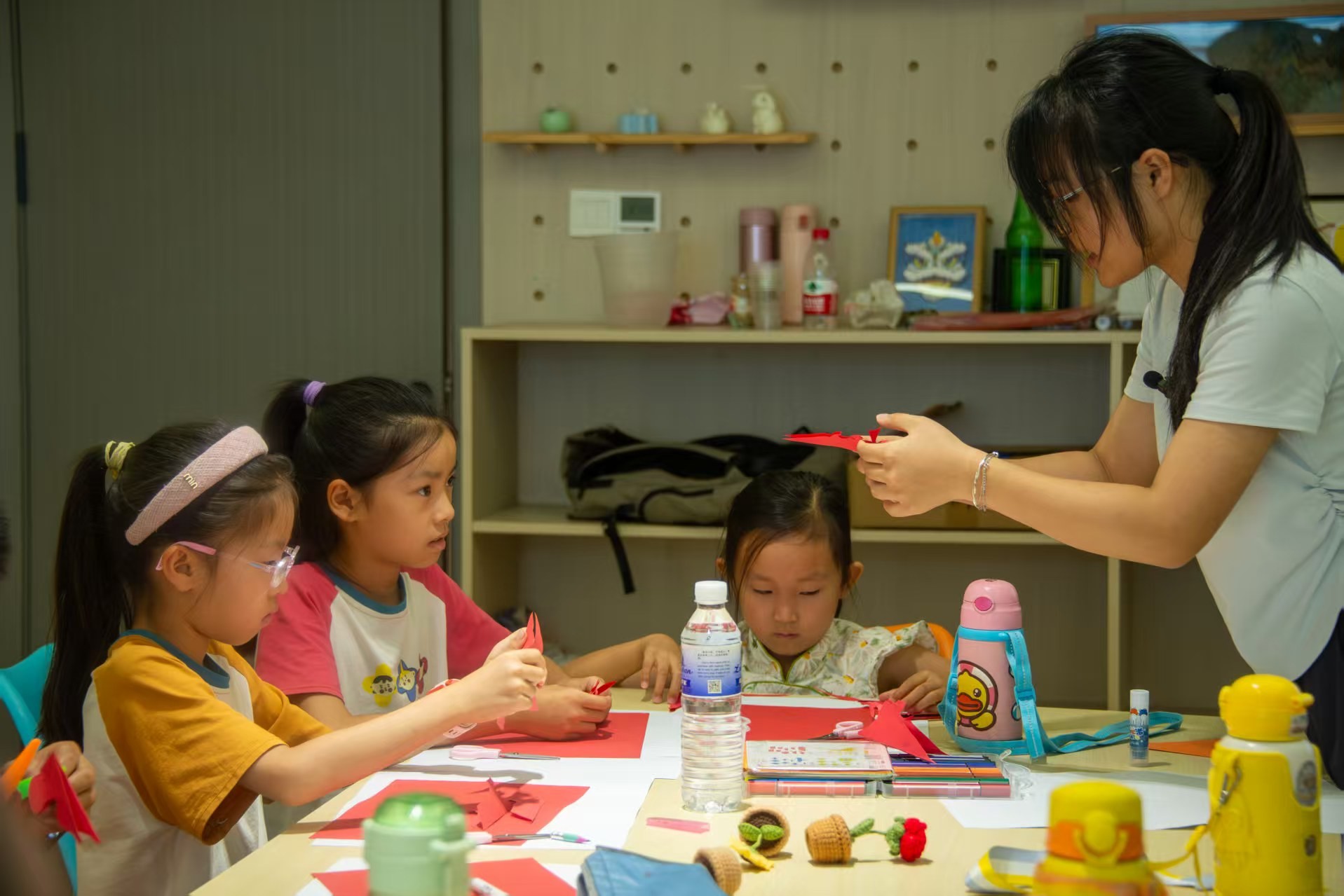 課桌上,彩紙、剪刀整齊排列,孩子們圍坐成圈,眼里滿是期待。8歲的李同學(xué)是第一次使用剪刀,指尖微微發(fā)抖,徐暢見狀,立刻俯下身,手把手帶著她調(diào)整姿勢、控制力度。半小時后,當(dāng)“白鴿銜著橄欖枝”的剪紙作品在手中成型時,李同學(xué)興奮地舉起作品歡呼,還特意貼上“1945-2025”的紀(jì)念貼紙,紀(jì)念抗戰(zhàn)勝利八十周年。
