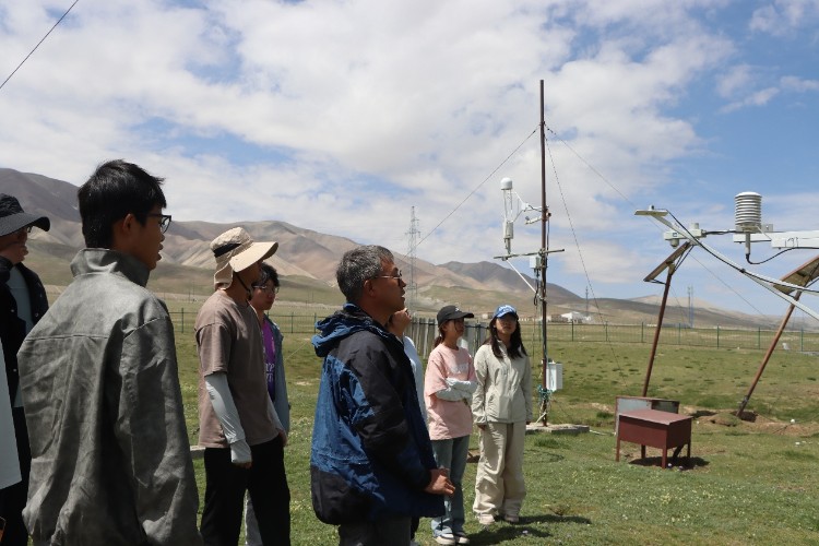 次日,實(shí)踐團(tuán)踏上青藏線,奔赴海拔更高的西大灘野外觀測(cè)場(chǎng)進(jìn)行實(shí)地考察。這里地處多年凍土與季節(jié)性凍土過(guò)渡帶,是研究?jī)鐾磷兓捌涔こ汰h(huán)境效應(yīng)、冰凍圈災(zāi)害孕育條件的天然實(shí)驗(yàn)室。在科研人員指導(dǎo)下,同學(xué)們?cè)敿?xì)察看了布設(shè)在野外的自動(dòng)氣象站、活動(dòng)層監(jiān)測(cè)探頭、地溫監(jiān)測(cè)鏈以及用于識(shí)別的地表變形監(jiān)測(cè)設(shè)備等關(guān)鍵設(shè)施。喬永平老師向隊(duì)員們講述了這些監(jiān)測(cè)設(shè)備是如何持續(xù)收集氣溫、降水、土壤濕度、活動(dòng)層厚度乃至潛在災(zāi)害跡象等第一手科學(xué)數(shù)據(jù)。