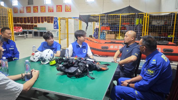探秘救援基地,解鎖裝備“密碼” 上午,調(diào)研團(tuán)成員抵達(dá)藍(lán)天救援隊(duì)訓(xùn)練基地,剛踏入基地,各類擺放整齊的專業(yè)救援裝備便吸引了大家的目光。藍(lán)天救援隊(duì)副隊(duì)長熱情接待團(tuán)隊(duì),隨后以“實(shí)物講解+場景還原”的方式,為成員們詳細(xì)介紹裝備知識(shí)——從基礎(chǔ)的救生衣、救生圈等常規(guī)救生設(shè)備,到具備定位、探測功能的先進(jìn)水下探測儀器,再到應(yīng)對復(fù)雜水域救援的沖鋒舟、救援繩索系統(tǒng),副隊(duì)長不僅講解了每類裝備的核心功能,還結(jié)合過往救援案例,分享了裝備在不同場景下的使用技巧與注意事項(xiàng)。