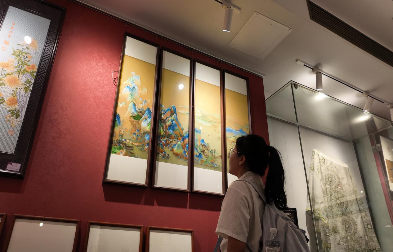 (“青創南粵”實踐隊隊員在潮繡世家內欣賞潮繡繡品)