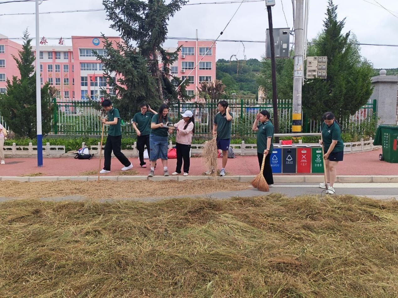 圖為團隊成員們一起幫助村民晾曬胡麻。梁晨 攝