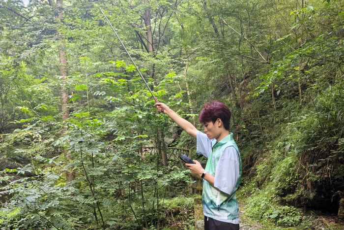 海拔梯度監測點上,溫度計與濕度計在隊員手中傳遞。在十堰市疾控中心專業人員指導下,團隊系統記錄不同區域的空氣溫濕度、風速等參數,探索森林“呼吸節律”。隨著觀測深入,規律逐漸顯現,不同植被類型宛若自然的生態工程師,無聲塑造著微氣候空間。這些發現為構建“環境因子—康養效果”關聯模型提供了關鍵支撐,也讓隊員們深刻體悟到——每一簇葉叢都是森林生命網絡的參與者。