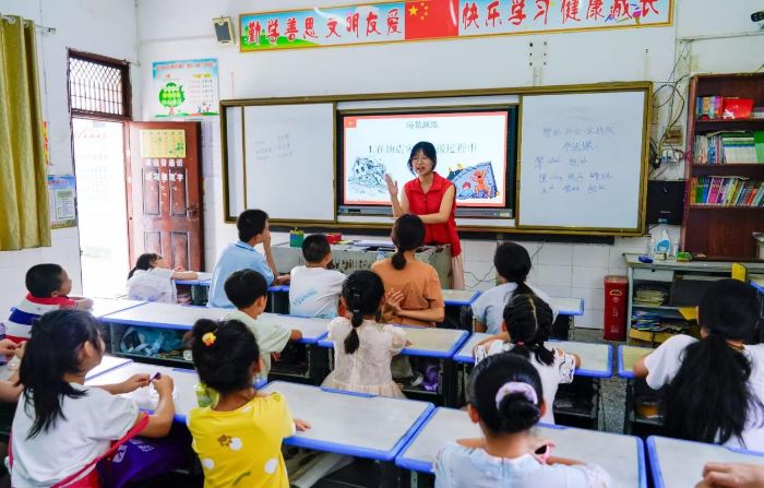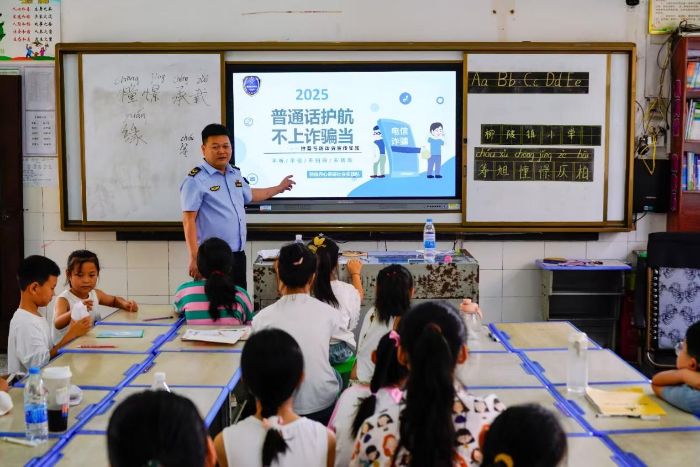 與此同時,實踐隊員李佳儀也以清晰標準的普通話,一字一句地為孩子們帶來了生動的防詐騙課堂。她借助推普課堂的契機,將防詐知識融入其中,讓孩子們在濃郁的普通話氛圍里輕松學習防騙技巧。這場特別的活動,不僅助力提升語言溝通能力,更有效增強了大家的防詐意識,為減少詐騙發生、為鄉村振興添磚加瓦。