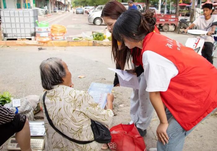 實踐不止于“看”,更在于“行”。隊員楊依淋、周祖倩走上街頭,化身“防詐宣傳員”,用通俗易懂的話語拆解詐騙套路,將防騙知識送到村民手中。一句句耐心講解,一張張宣傳彩頁,織密了鄉村反詐的“防護網”,為鄉村振興注入穩穩的安全感。