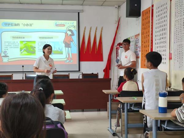 隨后,實踐團成員王彤彤、范子龍帶來了精心準(zhǔn)備的石油知識課。他們用通俗易懂的語言,為孩子們講解了石油的形成、開采過程及其在生活中的廣泛應(yīng)用,引導(dǎo)大家認(rèn)識到石油作為“液體黃金”的重要價值。課堂中,孩子們踴躍發(fā)言,積極提出“守護石油”的小方法,展現(xiàn)出對能源問題的初步思考和責(zé)任感。